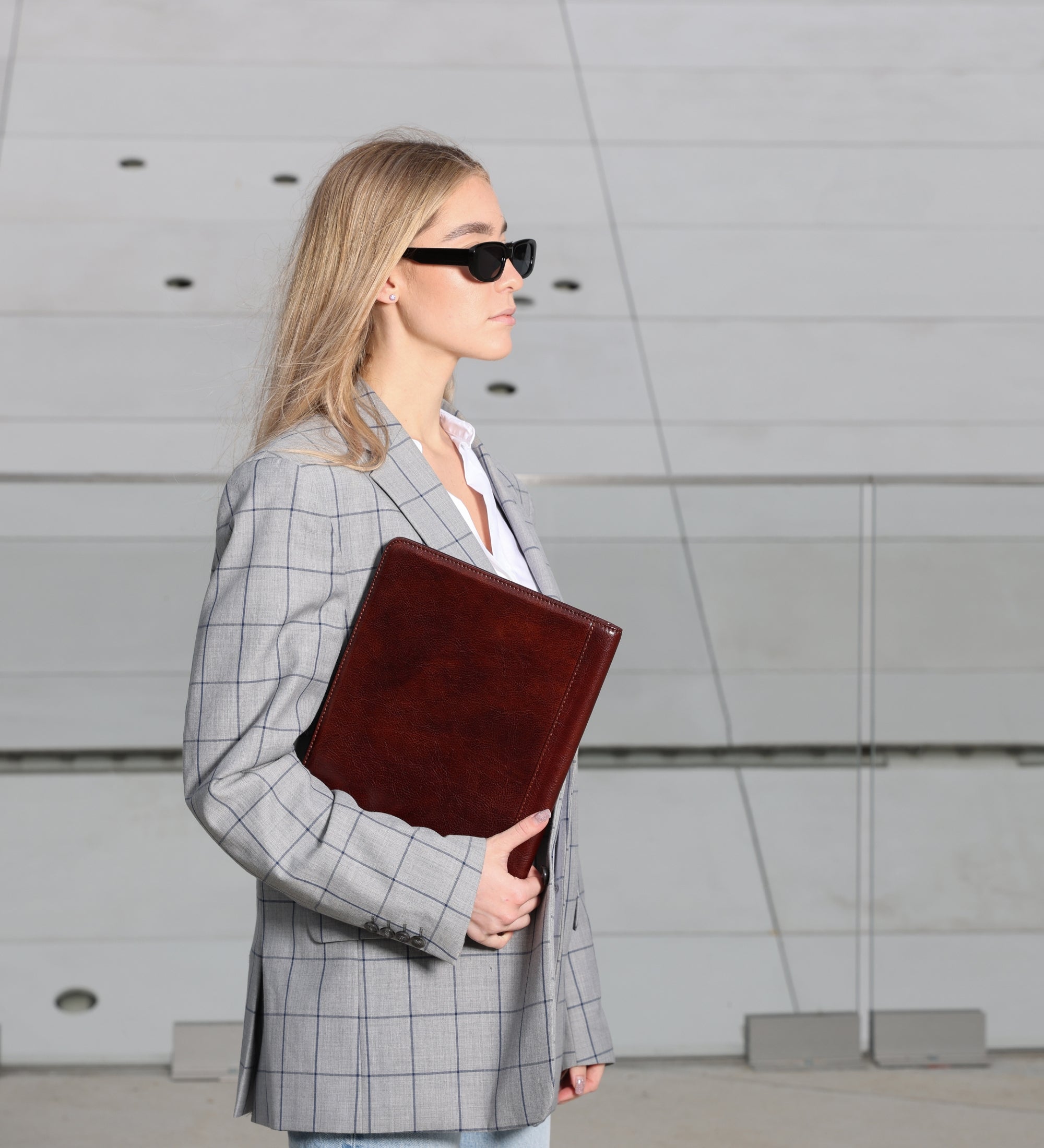 Spelar ingen roll om du förbereder pappersarbete inför en presentation med höga insatser eller skyddar din surfplatta inför ett viktigt möte, den här dokumentmappen ser till att du alltid är redo att göra ett bestående intryck. Innanför dess eleganta utsida finns en rymlig interiör, klädd med ett skonsamt material som innesluter dina enheter och papper och skyddar dem från repor och skador. Med flera pennöglor och genomtänkta kortfacken är varje detalj noggrant övervägd för att du kan kunna effektivisera ditt arbetsflöde och förbättra din organisatoriska förmåga. Ge din professionella person ett lyft med vår dokumentmapp i läder; sinnebilden av funktion och ambition.