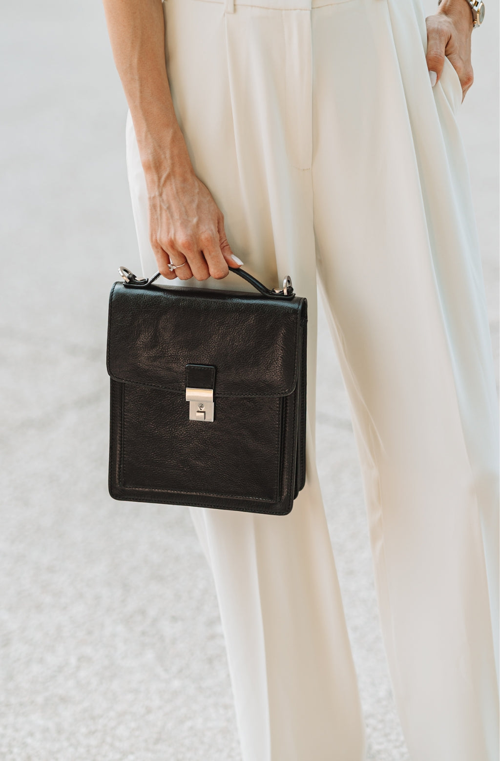 Det här är en perfekt följeslagare för den moderna mannen. En liten portfölj i fullnarvsläder med klassiskt, tidlöst utseende och en stabil ram för dig som gillar att hålla det lätt och lämna hemmakontoret hemma. Men då du inte får plats med din plånbok, smartphone, nycklar och nu även en surfplatta i dina byxfickor, är det här väskan som rymmer allt det där som du inte kan lämna hemma. Den här lilla och kompakta väska ser ut som en klassisk affärsportfölj, kombinerat med enkelheten i att bära en axelremsväska.