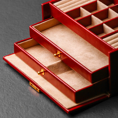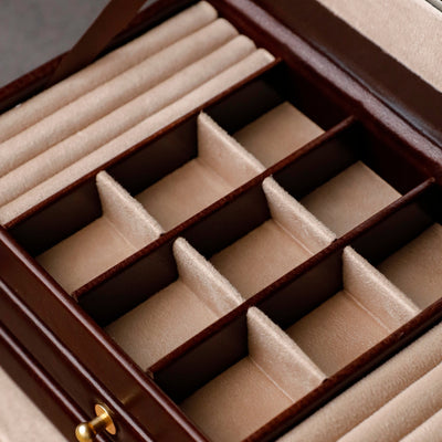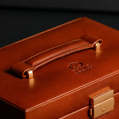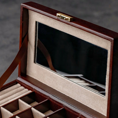 Vårt smyckeskrin med rojalistisk look i läder lägger till en touch av lyx till ditt sminkbord. Med en doft av italiensk elegans kommer detta smyckeskrin att erbjuda skyddad förvaring för dina värdefulla accessoarer. Fodrad med mjuk textil för att skydda dina ömtåliga smycken och ädelmetaller. Håll dina smycken välorganiserade och säkra!