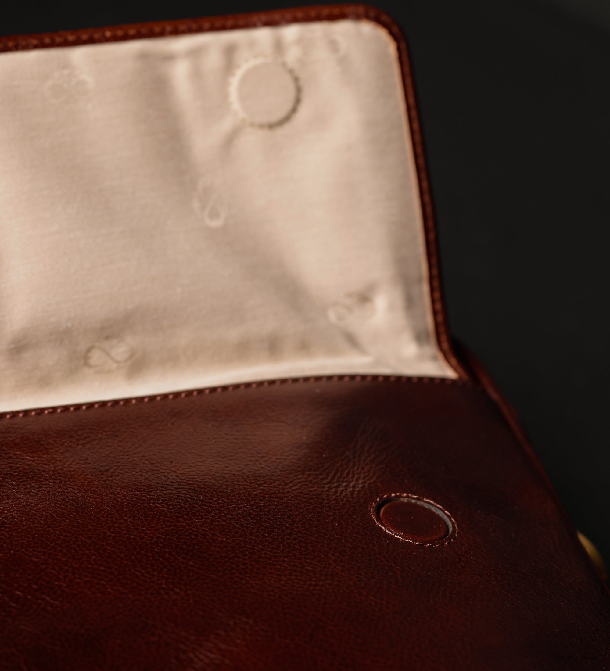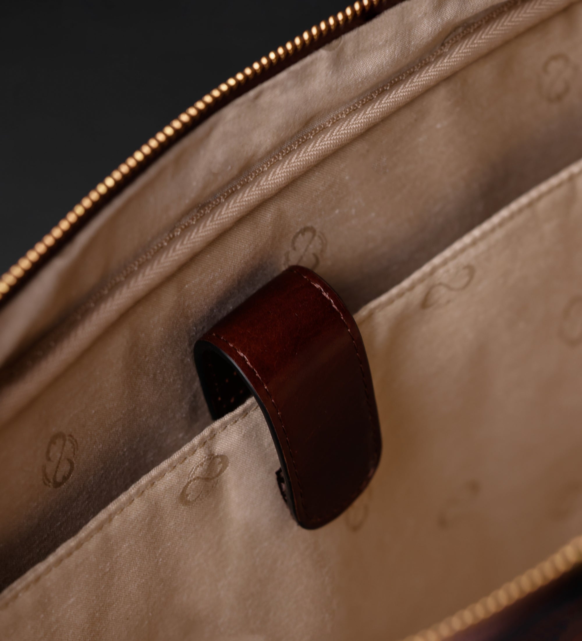 The Sheltering Sky – den här portföljen i läder är en utmärkt följeslagare på jobbet eller vid studier. Dess gedigna utseende är perfekt anpassat för både mäns och kvinnors behov. Den är tillverkad i italienskt fullnarvsläder och levereras den med en trolleyrem och en avtagbar axelrem, vilket gör den en perfekt parter vid resor. De rymliga facken rymmer enkelt papper i Legal-format, A4-dokument och mappar, dessutom har den även plats för en 15-tums laptop. Och om inte detta räcker – har vi gjort en extra ficka med lock på framsidan och en extra stark magnetstängning, perfekt för att hålla dina viktiga saker lättillgängliga.