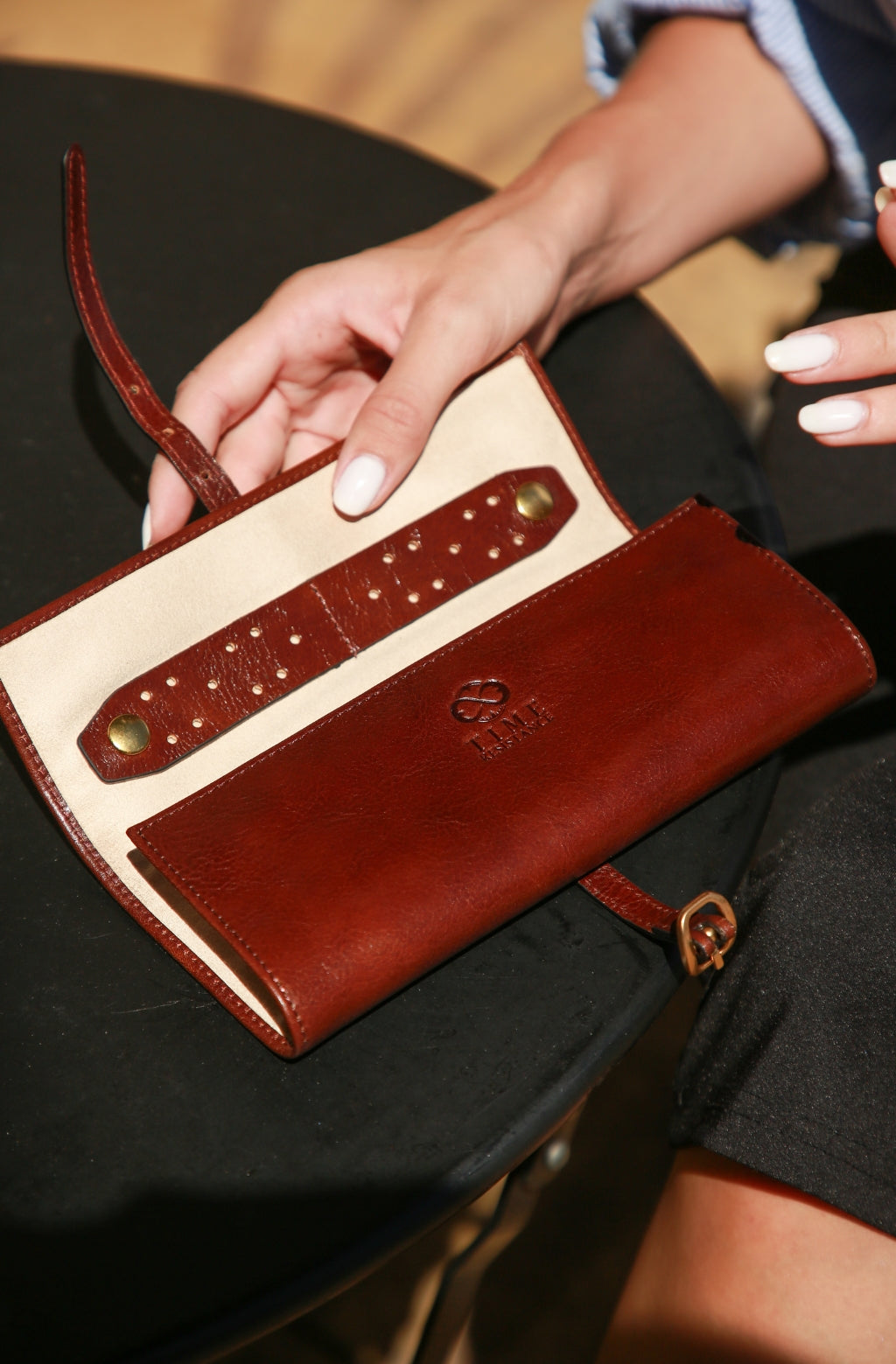 Rulla ut denna pärla i läder och se vad som är en fristad för dina värdefulla föremål. Noggrant designade fack och fickor som förvarar dina smycken eller kosmetika och ser till att dessa ligger orörda och skyddade. Denna lilla smyckesrulle i läder kommer att bli din personliga skattkista och skyddar dina värdesaker med stil.