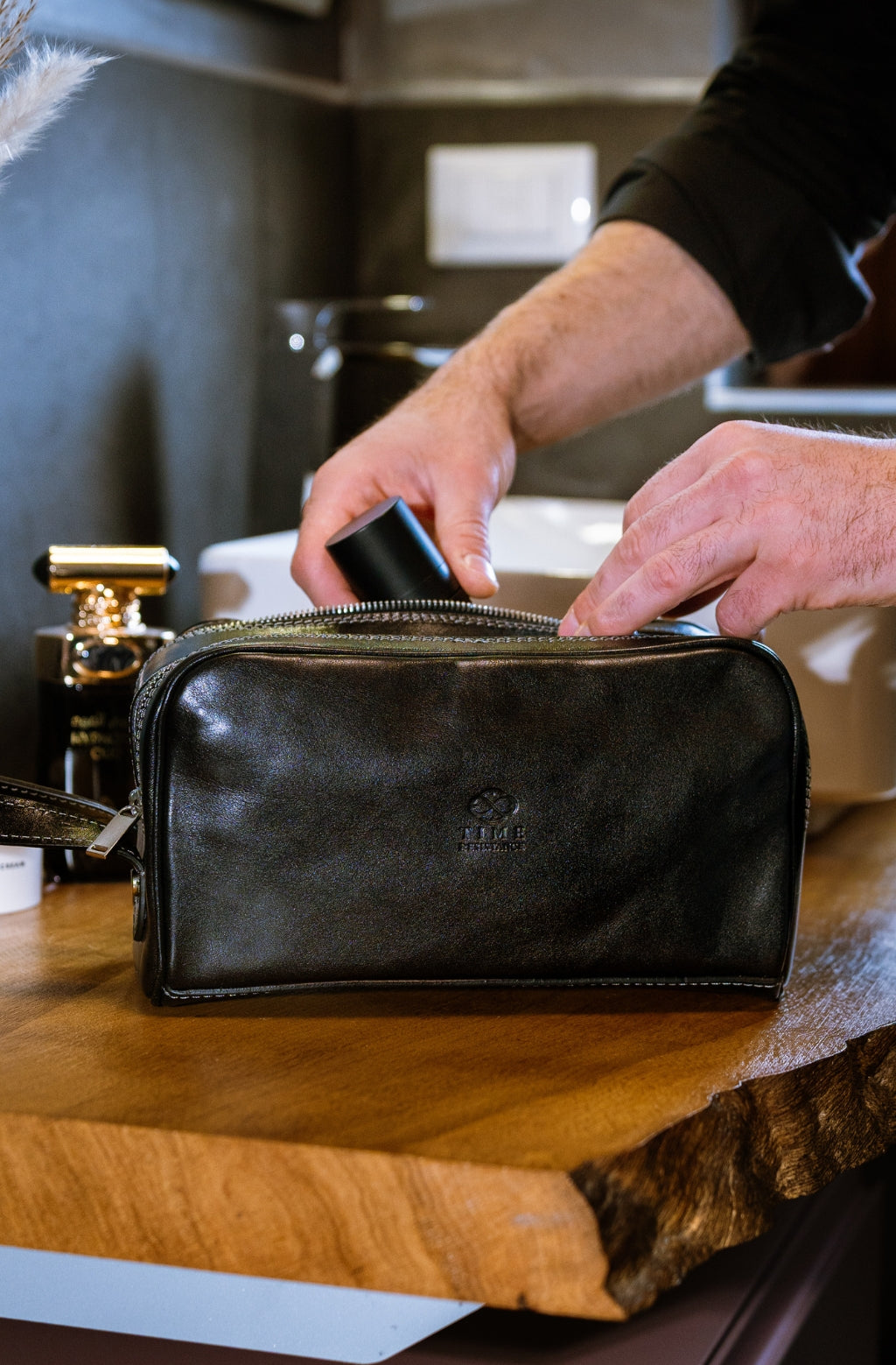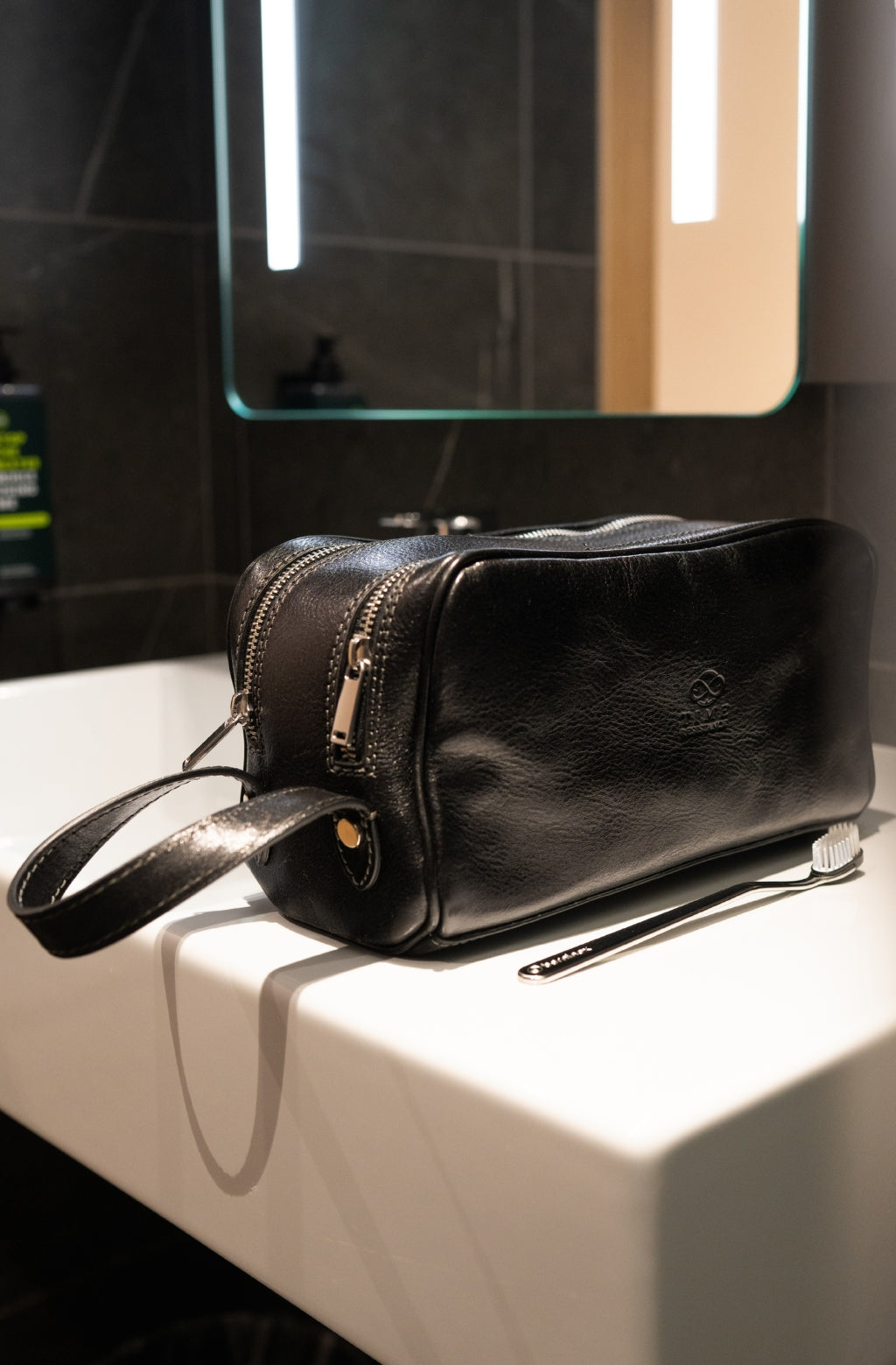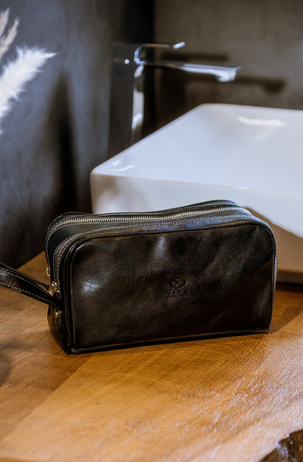 Ytterligare en perfekt designad kostmetiketui/necessär i läder för män (och inte bara för dem). Två separata fack som har tillräckligt med plats att rymma allt du behöver. Två innerfickor för att hålla saker separerade från andra. Enkel och klassisk design, bekvämt planerad för att passa en mans alla behov.