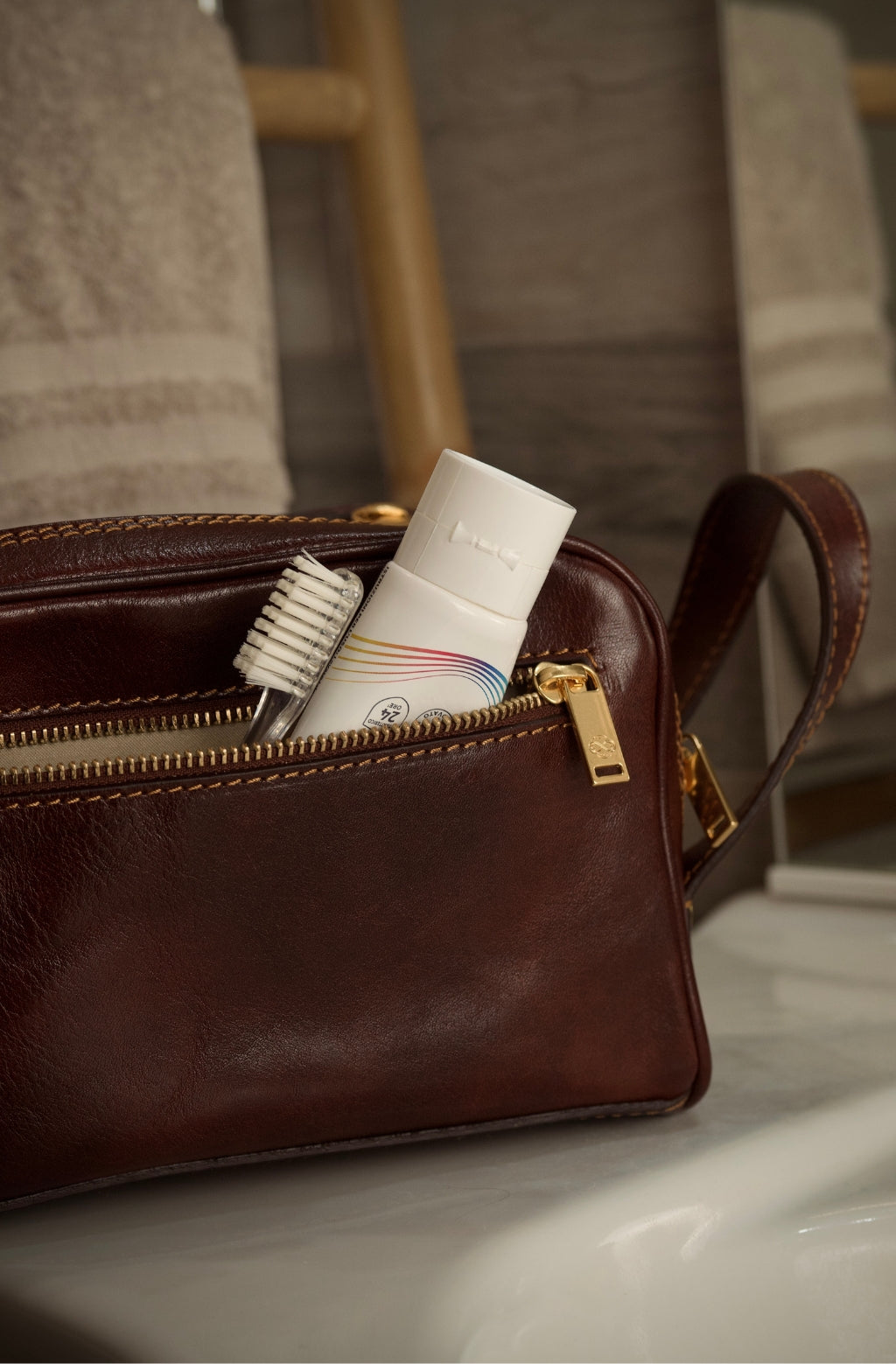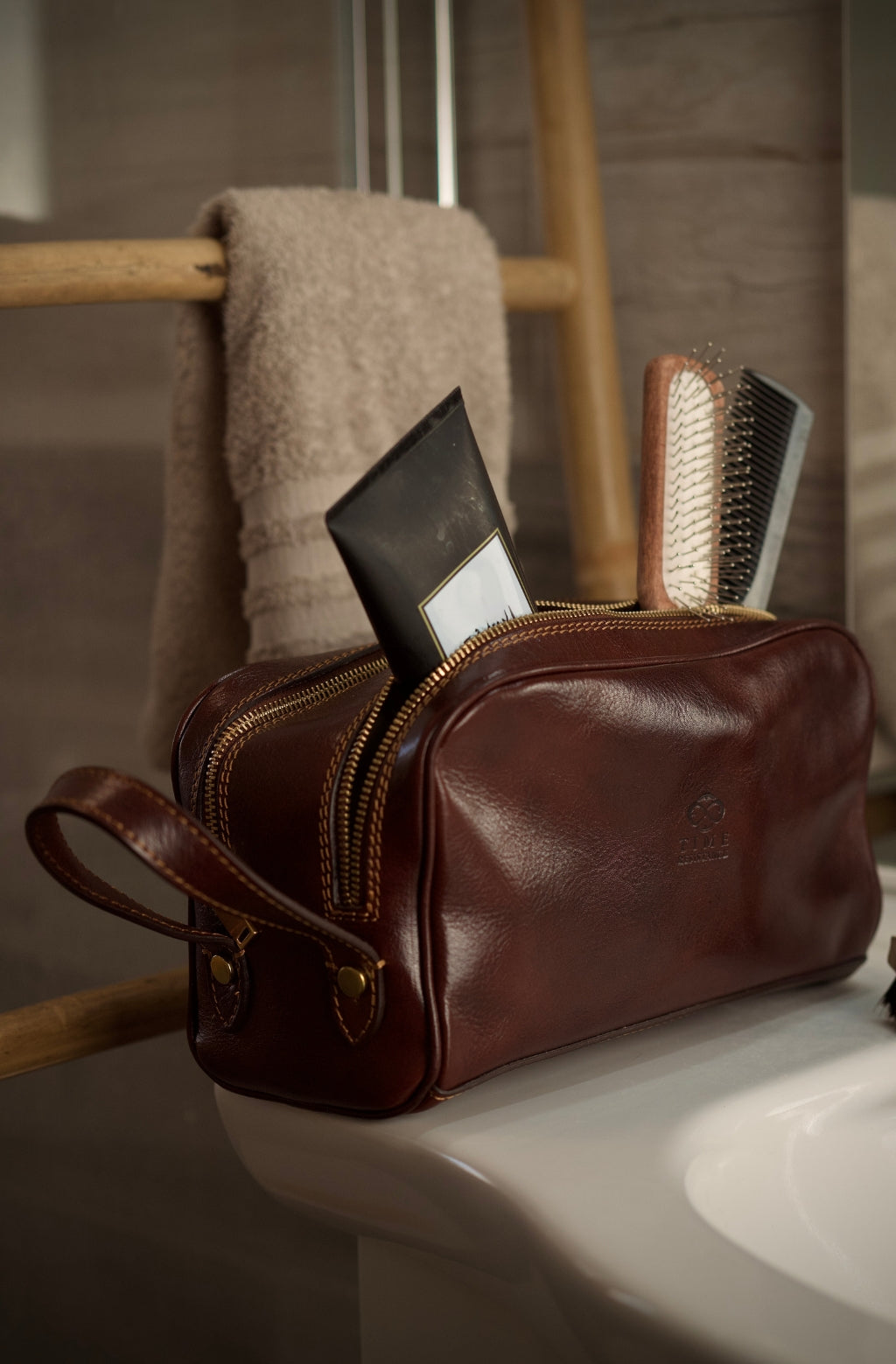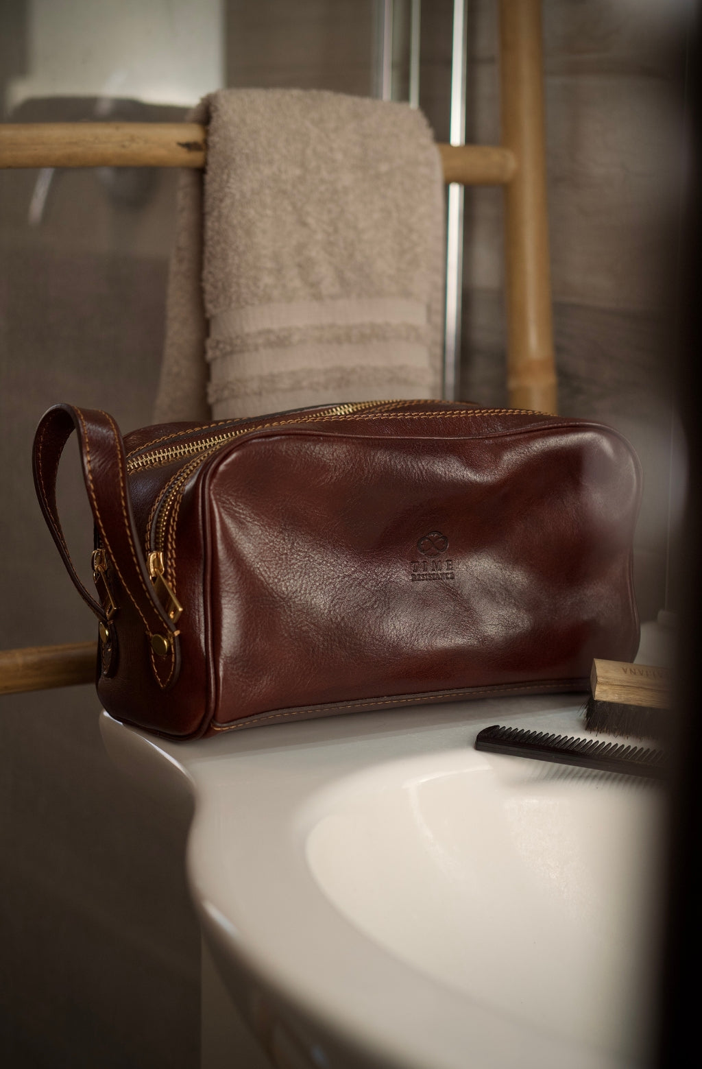 Ytterligare en perfekt designad kostmetiketui/necessär i läder för män (och inte bara för dem). Två separata fack som har tillräckligt med plats att rymma allt du behöver. Två innerfickor för att hålla saker separerade från andra. Enkel och klassisk design, bekvämt planerad för att passa en mans alla behov.