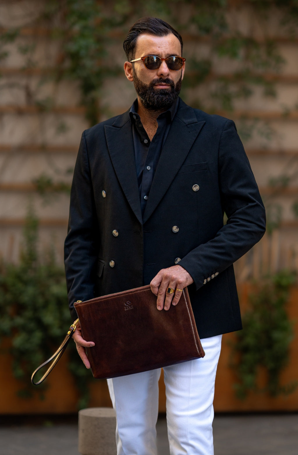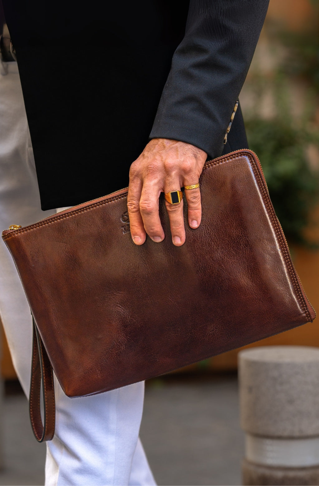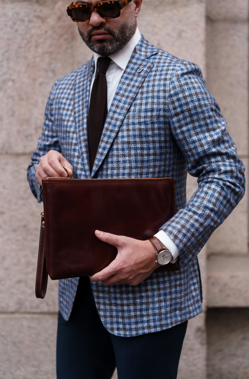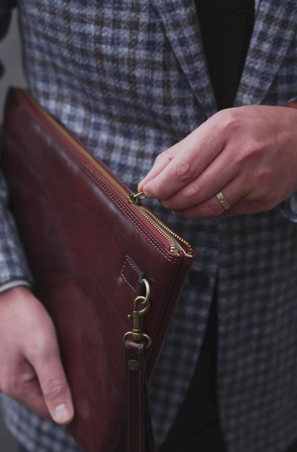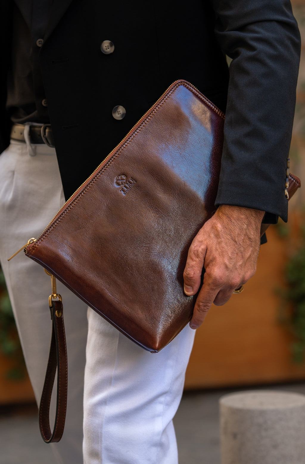 En maskulin clutchväska i italienskt läder. Minimalistisk design, perfekt för dig som gillar enkelheten utan att behöva ge avkall på elegans. Den rymmer alla dina nödvändigheter i vardagen, inklusive smartphone, en liten surfplatta osv., och ger dig en fullt affärsmässig look dock med en nypa elegans.